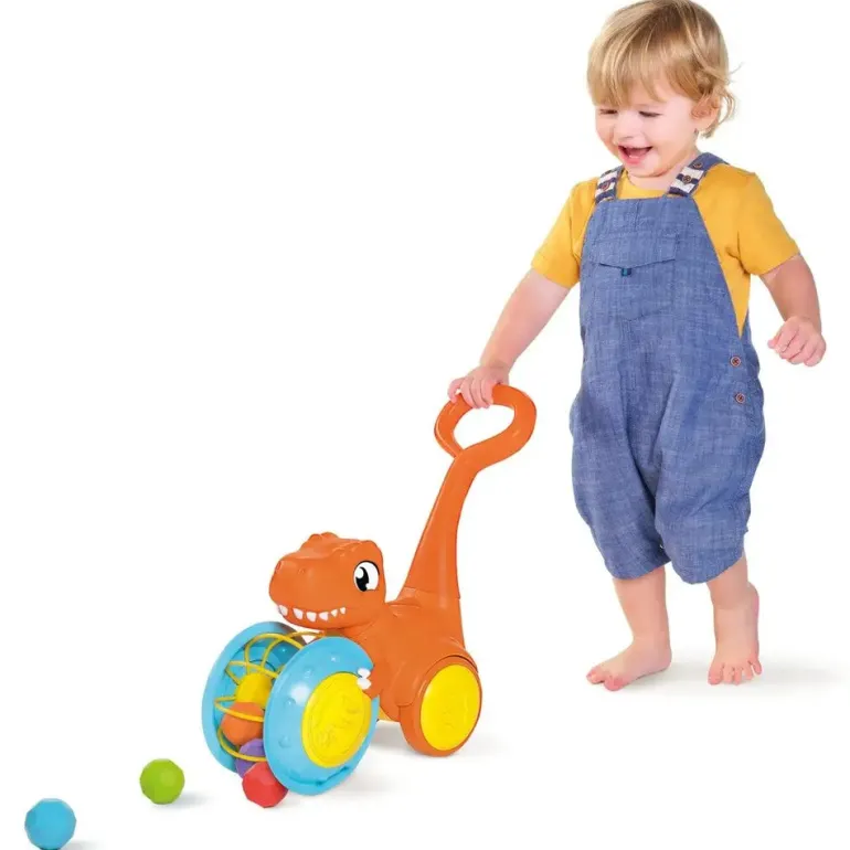 Dette store T.rex aktivitetslegetøj er klar til eventyr og designet til at få små børn til at tumle og gå, alt imens det motiverer udviklende leg. Der er to måder at lege på. Skub T. Rex frem ved at bruge håndtaget, der er let gribe fat om for små børn, og rul hen over de farverige sten for at samle dem i gyrokuglen. De vil blive henrykte over, hvordan den på magisk vis samler stenene op, når den ruller hen over dem. Dette legetøj, der er nemt at betjene, er perfekt til at motivere småbørn til de første skridt og dermed udvikle grovmotoriske færdigheder. Hvis dit lille barn ikke er kommet helt på benene endnu, fungerer gyrokuglen også separat som gulvaktivitetslegetøj til kravleleg.