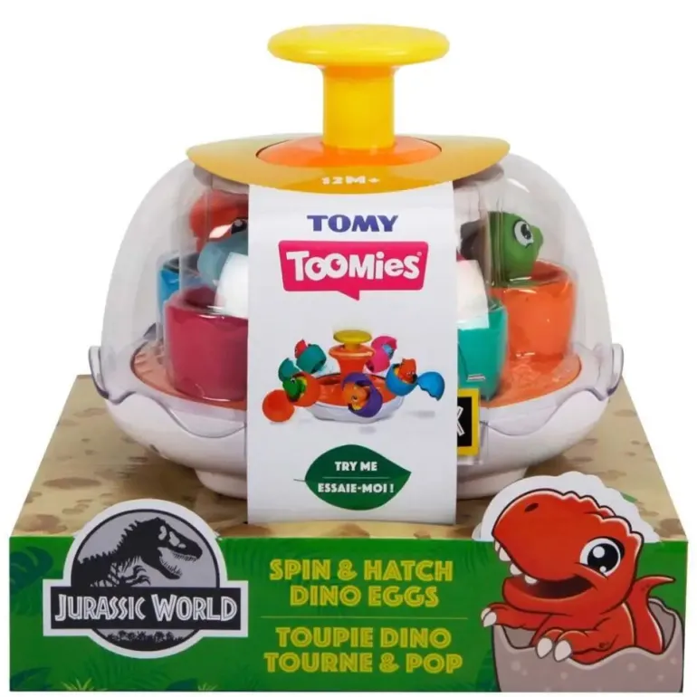 Toomies giver fascinationen af dinosaurer videre til en ny generation med Jurassic World Spin & Hatch Dino Æg! Dette dinosaurlegetøj er klar til eventyr og er designet til at fremme udviklende leg for babyer og småbørn. Spin & Hatch Dino Æg er en roterende rugemaskine, der indeholder 5 søde, farverige, klassiske dinosaurer: T.rex, raptor, stegosaurus, triceratops & Pteranodon. Ryst hver af disse små dinoer og hør deres søde, knurrelyde. At matche hver dinosaur med den korrekte farve i skal fremmer logik og problemløsningsevner. Så er det er tid til at fylde den roterende rugemaskine med alle fem farverige æg og hjælpe med at klække dem! Skub blot håndtaget ned og se dem snurre rundt. Skub hurtigere og hurtigere indtil … POP! De er udklækket! Match dem med deres skaller og gør det igen! Eller læg dem tilbage i rugemaskinen og luk låget for nem opbevaring. En sjov måde at arbejde med finmotorik på, mens børnene lærer om handling og reaktion.