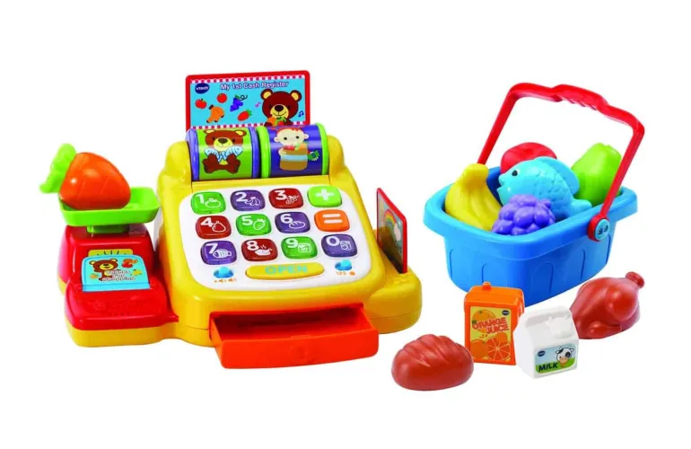 Vil du med ud og handle? Med Vtech kasseapparat kan du være butikschef, eller du kan handle ind sammen med dine venner. Der medfølger indkøbskurv, legemad, kreditkort, og frugtvægt. Kasseapparatet har 13 knapper, som er med til at lære barnet om tal, farver og fødevarer. Åben kasse og swipe kortet igennem! Alder 1-3 år.