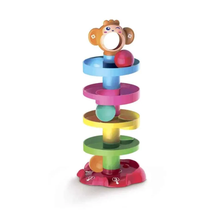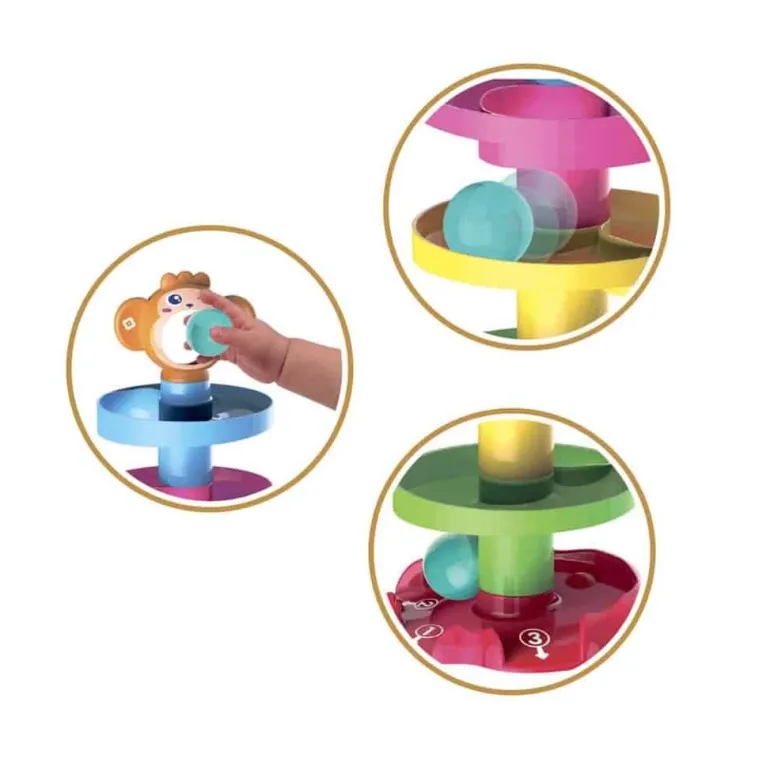 Sjov abe-kuglebane fra Scandinavian Baby Products. Let at samle, hvorefter barnet kan slippe boldene løs via abens ansigt. Herefter suser boldene rundt i cirkler for til sidst at ende på gulvet med god fart. Inspirerer barnet til at kravle og bevæge sig efter boldene.