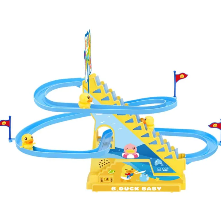 Sjovt B.Duck Baby Rutsjebaneland, hvor barnet kan se ænderne rutsje efter tur i rutsjebanen, mens musikken spiller. Ænderne kan nemt flyttes rundt, og de har dobbelthjul for at kunne rutsje bedst muligt. Det sjove B.Duck Baby Rutsjebaneland er let at samle med numre på den løse del og og “trappe”-delen.