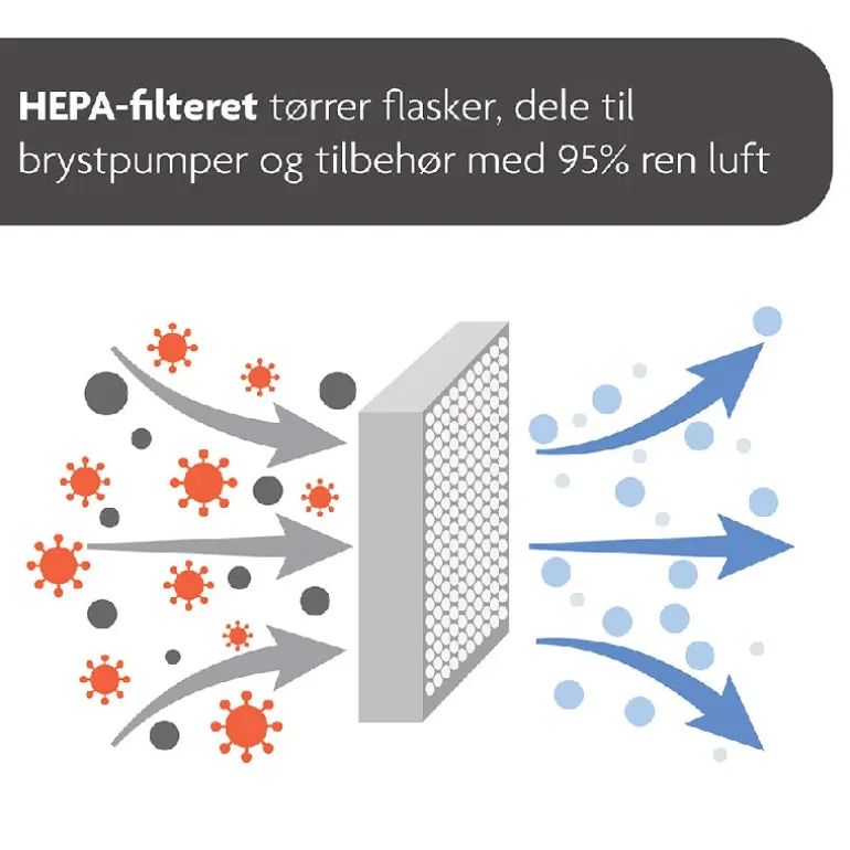 – Dræber 99,9 % af alle bakterier med naturlig damp. Tørrer derefter automatisk alt 33 % hurtigere med varm luft, der er 95 % bakteriefri takket være det udskiftelige HEPA-filter. Produkterne forbliver helt sterile indeni i op til 24 timer