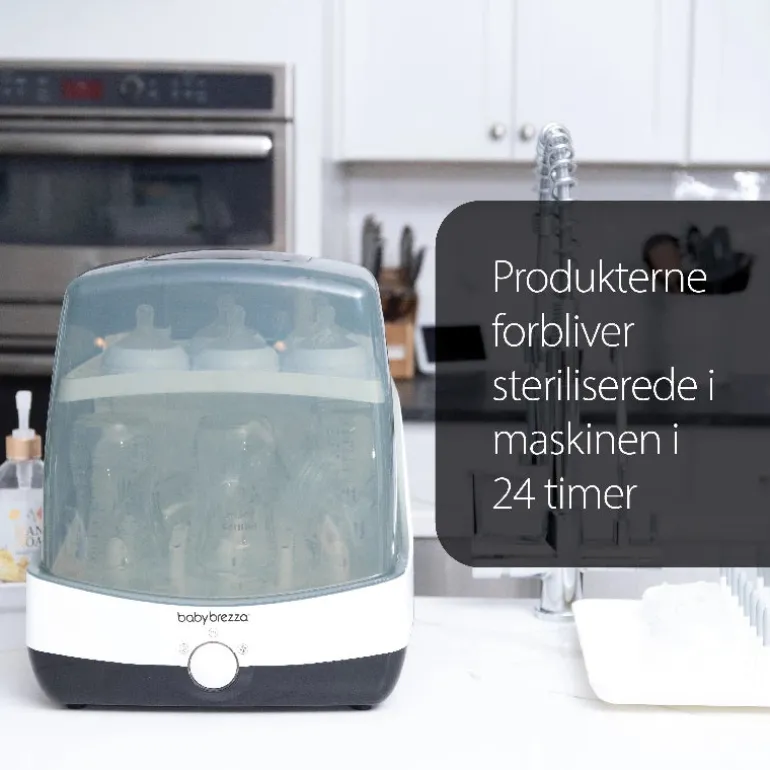 Baby Brezza SuperFast Sterilizer Dryer er den hurtigste sterilisator og tørremaskine. På bare 10 minutter steriliserer og tørrer den flasker, brystpumpedele og tilbehør helt automatisk. Den er 75 % hurtigere end andre sterilisatorer, så du kan tage flasker med på farten uden at behøve at planlægge brugen af flasker på forhånd. Ved hjælp af naturlig varm damp dræber den 99,9 % af alle bakterier og tørrer derefter automatisk alt med varm luft. Produkterne forbliver steriliserede indeni i op til 24 timer. Den har plads til 6 flasker, brystpumpedele og tilbehør fra alle mærker. Med et enkelt tryk på en knap kan du vælge mellem 4 forskellige programmer (Sterilisering og Tørring; Kun Dterilisering; Kun Tørring; Opbevaring). Sig farvel til en gammeldags måde at sterilisere på, og sig goddag til SUPERSNABB-sterilisering og -tørring! BPA-fri. 2 års begrænset garanti.