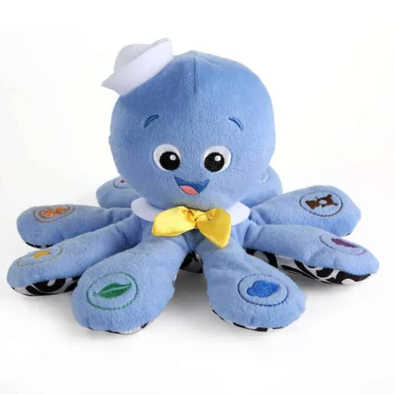 Store tænkere starter i det små! Med den skønne plysblæksprutte fra Baby Einstein kan baby opdage og udforske en verden af forskellige farver, musik og sjov! Denne plys aktivitetsbamse er elskværdig og elsker at blive krammet. Hver krammer frigiver nye farver og lyde. På alle ben kan du finde sjove billeder. Når man trykker på det, vil farven blive nævnt og en melodi blive spillet. Du kan skifte mellem engelsk, spansk og fransk, så din lille bliver til et vaskeægte sprogtalent. Denne plys blæksprutte vil finde en plads i dit babys hjerte med det samme.