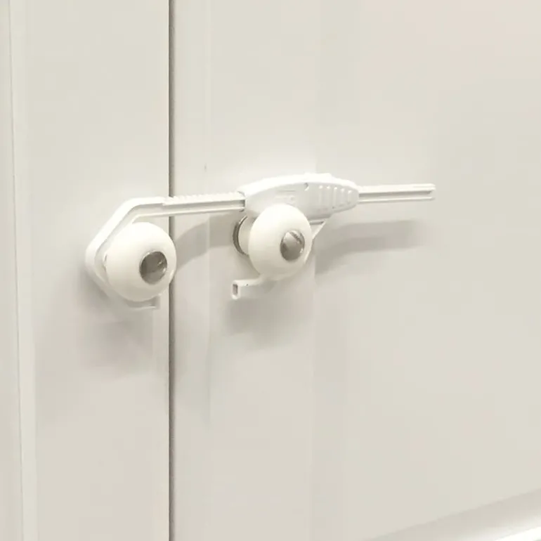 Håndtag og greb er fristende for børn. Lågesikring fra BabyDan sikrer dit skab mod små pilfingre. Låsen er perfekt til praktisk dobbeltlågesikring, hvor der er lodrette håndtag på køkkenskabe eller køle/fryseskabe. Hurtig og nem montering – og skabet er forsvarligt sikret. En voksen, kan med en hånd afmontere låsen – og der igen er adgang til skabet.