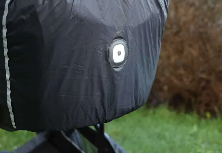 Smart barnevognsregnslag med insektnet samt med LED lys og refleks for større synlighed i trafikken. LED-enheden har 2 funktioner, stærkt hvidt lys og rødt blink. Den tages ud og lades med USB. Passer på de fleste barnevogne. Materiale: 100% akryl. Fastsyet på indersiden af regnslaget sidder dets pose, så det er let lige at pakke sammen, lyne posen og hænge den på styret med velcrobåndene i toppen.