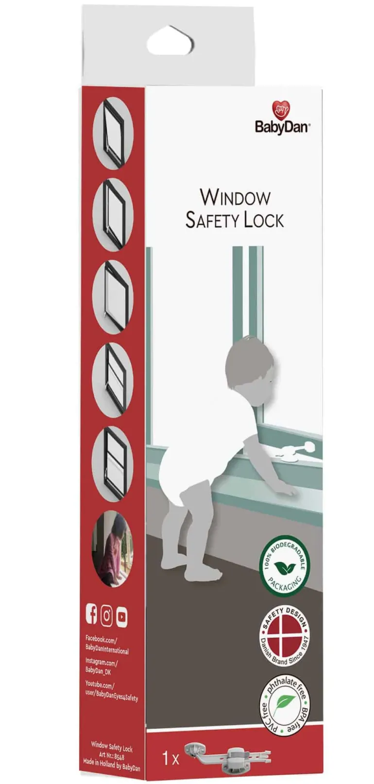 Du kan børnesikre vinduerne med vindueslåsen, som forhindrer faldulykker men giver samtidig mulighed for at lufte ud. Låsen passer til trævinduer med indvendige og udvendige hængsler og vertikale skydevinduer. Vær opmærksom på, at børn omkring 4 år kan være i stand til at åbne børnesikringsmekanismen. Med vindueslåsen forhindrer du ikke kun, at dit barn kommer ud for faldulykker i hjemmet – du tager også ansvar for den verden, som dit barn vokser op i, fordi emballagen er 100% bionedbrydelig og Cradle to Cradle certificeret. Det betyder, at den vil blive naturligt nedbrudt, når du smider den væk, og efterlader intet, som skader vores planet.