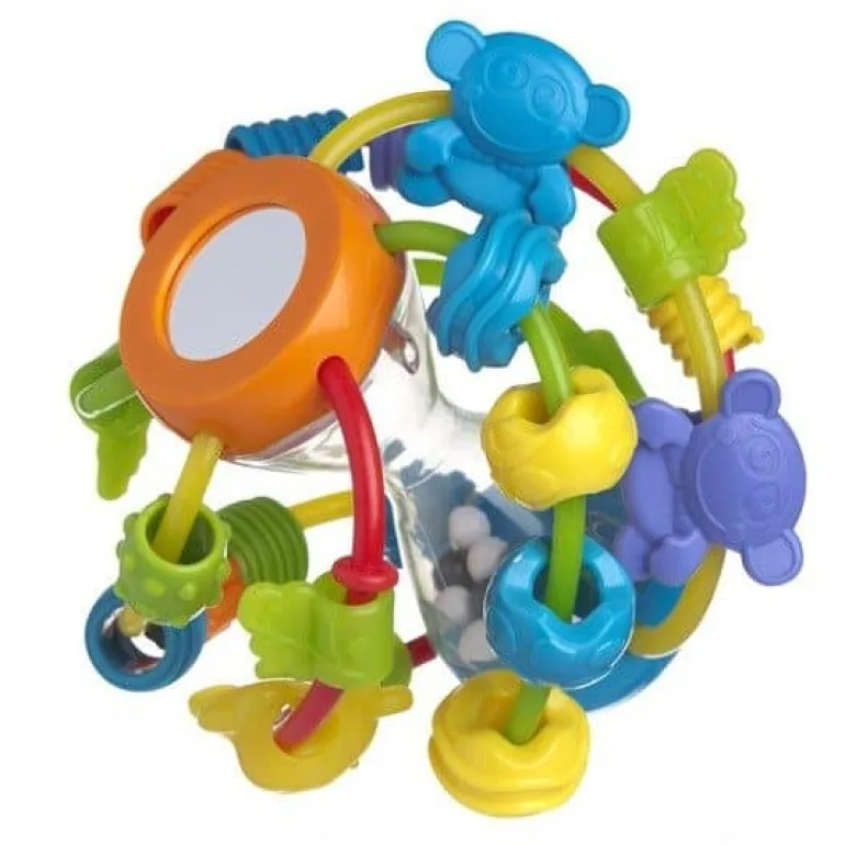 Gribebold med spejl, kugler og bideringe. Bolden er sjov for baby at udforske og let at holde på.