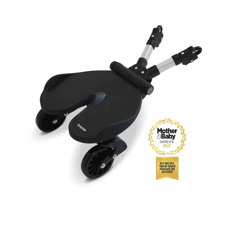 Bumprider Ståbræt. Dette ståbræt passer til alle barnevogne. Med det unikke monteringssytem, har ståbrættet en helt masse indstillingsmuligheder. Brættet har blandt andet en affjedringsteknik, som giver barnet en jævn ståplads til trods for en ujævnt underlag. Ståbrættet sættes blot fast på barnevognen nemt og enkelt – uden værktøj, og så er det klar til brug. Bumprider ståbrættet er et prisbelønnet barnevognstilbehør, og har fået meget opmærksomhed ude i verden. Brættet har vundet flere priser i England og i Sverige. Anbefalet alder: 2-5 år. Maks. belastning: 30 kg.