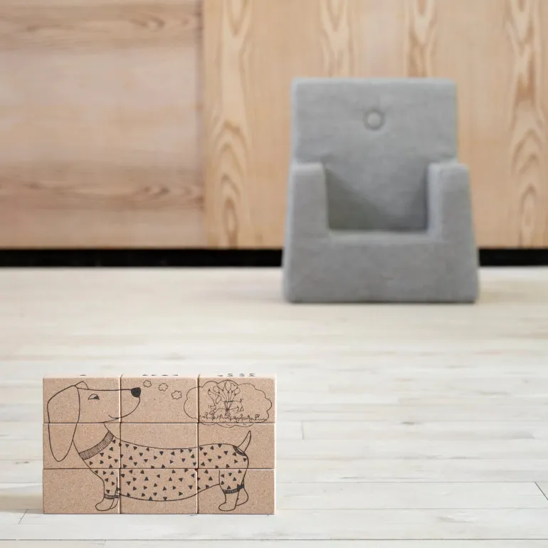 Disse ni korkklodser er ikke kun perfekte til at stable og bygge med – de er også designet som en sjov og lærerig puslespiloplevelse, der vokser med dit barn. Hver klods har forskellige laserprintede sider med elementer, der understøtter tidlig læring gennem leg.