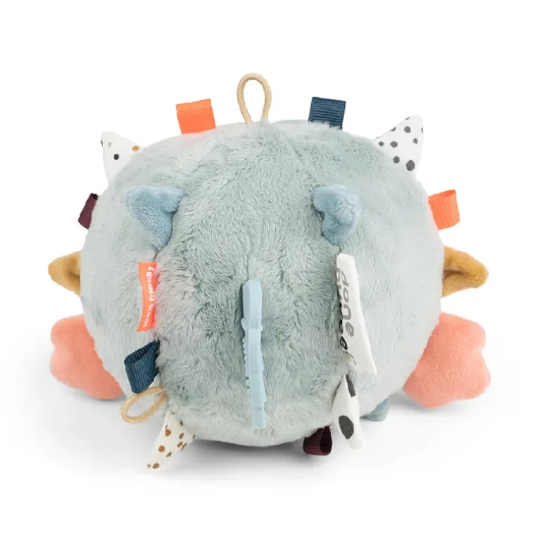Lad nysgerrige øjne og små fingre gå på opdagelse i Puffee-aktivitetsboldens mange sensoriske detaljer. Hold fast i Puffees bløde pigge og finner og lyt til de spændende knitrelyde. Mærk de forskellige strukturer, og udforsk de farverige mærker. Puffees runde form er perfekt til rul. Puf til den og hør den spændende lyd, der opfordrer de små til at kravle efter den. Silikone bideringen, formet som Puffees halefinne, har forskellige strukturer til at stimulere og berolige gummer som klør. Den kugleskøre kuglefisk er et mix af blå, pudder og mustard farver og har mange funktioner, der stimulerer fin- og grovmotorikken. Elastikken gør det let at fastgøre den til en legemåtte, klapvogn eller aktivitetscenter ved hjælp af en legetøjsring.