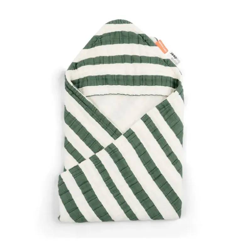 Det stribede håndklæde med hætte er perfekt til at pakke din baby ind i, så barnet bliver tør og lun efter et dejligt bad. Det bløde håndklæde i økologisk bomuld er i flere lag, der gør det let og rart mod huden og gør at det tørrer hurtigt. Brug det fine og behagelige håndklæde ved badetid, babysvømning eller på en strandtur. Håndklædets hætte sørger for at vand ikke løber ned fra håret mens kroppen tørres. Det hyggelige og bløde sandfarvede babyhåndklæde med hætte er dekoreret med brede grønne striber.
