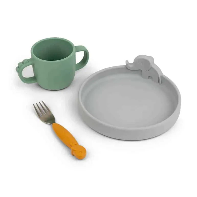 Peekaboo spisesættet er designet til at vække barnets nysgerrighed. Elphee, Wally og Croco titter frem fra servicet og gør spisetid ekstra sjovt. Børne servicet har en perfekt størrelse til de første måltider og når de små skal lære at spise selv. Den søde skål, gaffel og praktiske hagesmæk er lavet i fødevaregodkendt silikone, som gør det brud- og skridsikkert og ikke mindst sikrer et godt greb for barnet. Peekaboo skålen er velegnet til brug i mikrobølgeovn. De små vil elske at have de søde dyr med til bords – opdag Croco i bunden af koppen når der drikkes, og lad Elphee og Wally hjælpe de små med at nå den spændende milepæl det er, at kunne spise selv. Det søde gavesæt er i et mix af grå, grøn og mustard.