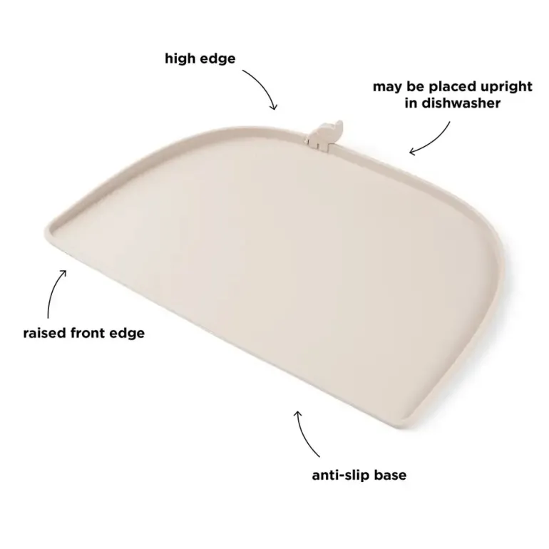 Silikone dækkeservietten har en praktisk kant foran samt en højere kant på siderne og bagved, der stopper spildt mad og drikke, inden det når resten af bordet. Den er nem at tørre over eller rengøre i opvaskmaskinen og har antiskrid på undersiden.