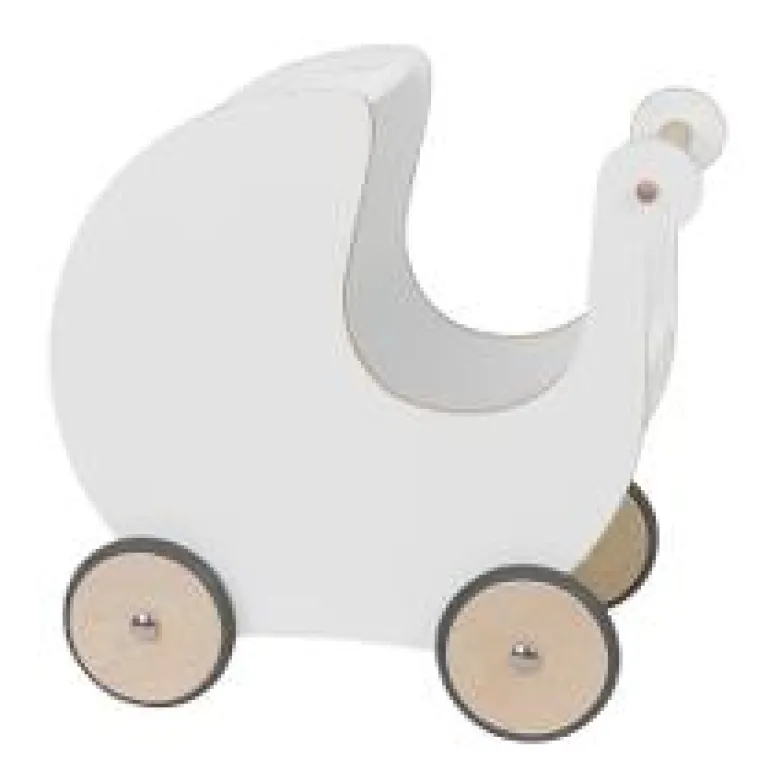 Dukkevogn i træ, hvid. Den klassiske Sebra dukkevogn i hvid, som altid er klar på en gåtur tværs over stuen. Dukkevognen er udstyret med gummihjul, hvilket gør den støjsvag, når den kører på trægulvet.