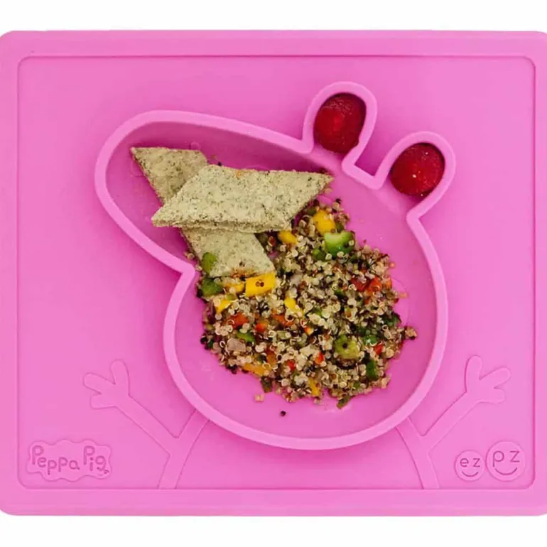 Den søde Peppa Pig Mat er skræddersyet til mindre børn, på turen eller rejsen. Og alle elsker jo den populære Gurli Gris. Ezpz Peppa Pig Mat er perfekt til serveringen af alle typer varme/kolde måltider, såsom pasta, frokost, grød, mos og youghurt, aftensmad. Egnet fra 4+ mdr.