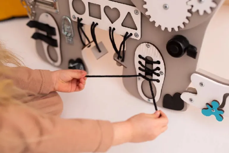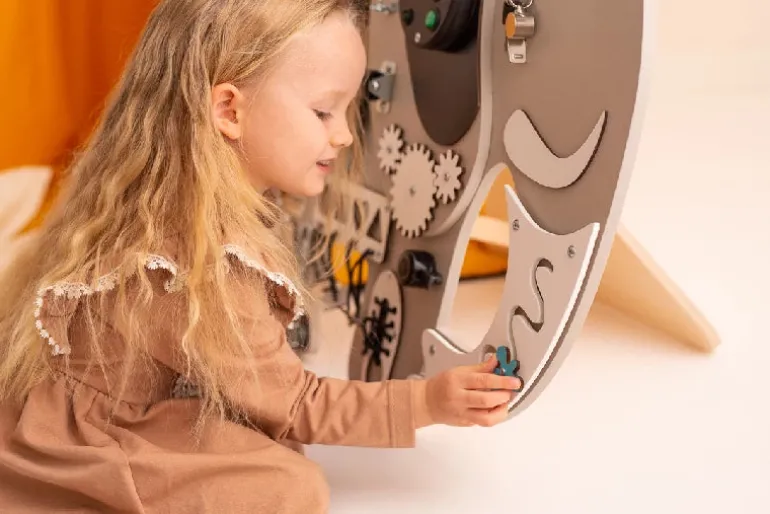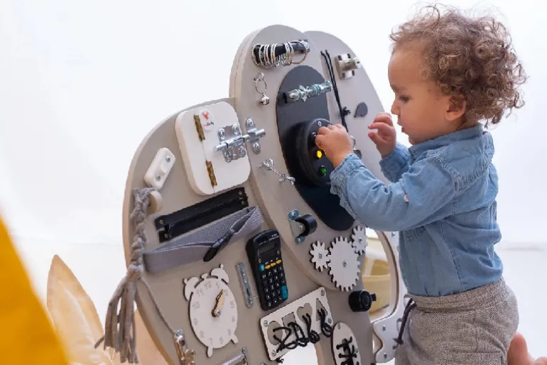 Sjovt og den aktivitetstavle med flest elementer!. Denne model kan både stå frit på gulvet og monteres på væggen.