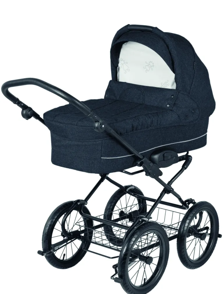 Meget rummelig barnevogn på letvægtsstålstel. Solid og robust vogn – virkelig topklasse komfort for både barn og voksen.Grande har bibeholdt sit klassiske look, men er samtidig moderne, stilfuld og trendy. Vælg mellem luft- eller punkérfri EVA hjul. Vægt inkl. stel: 20,5 kg Liggemål: 97 cm.