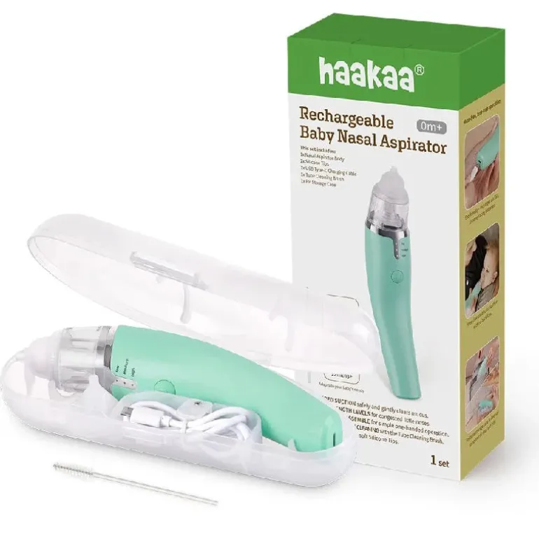 Haakaas genopladelige næseaspirator bruger en skånsom, men effektiv sugekraft for at lindre din lilles tilstoppede eller løbende næse. Dette praktiske lille redskab er nemt at bruge med blot en enkelt knap, der kan skifte mellem tre forskellige styrker for at rense selv de mest tilstoppede næser, med kun en hånd. Den leveres med to bløde og sikre silikonespidser der er helt perfekte til sarte små næser og kan let steriliseres efter brug.
