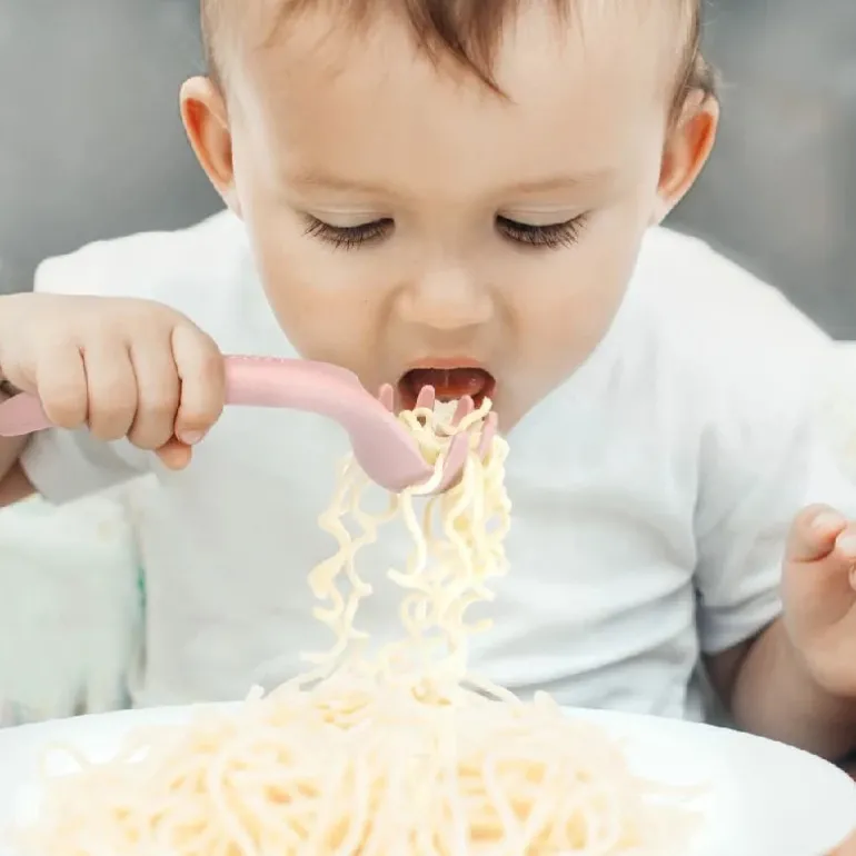 I modsætning til en almindelig ske eller gaffel tillader Haakaas unikke patenterede design dit barn at tage pasta op i skeens tænder i en opadgående bevægelse, hvilket fanger flere pastaer og holder dem på skeen. Det unikt bøjede håndtag tillader dit barn at gribe håndtaget bekvemt og let placere mad i munden, hvilket opbygger selvtillid og uafhængighed, mens de spiser.