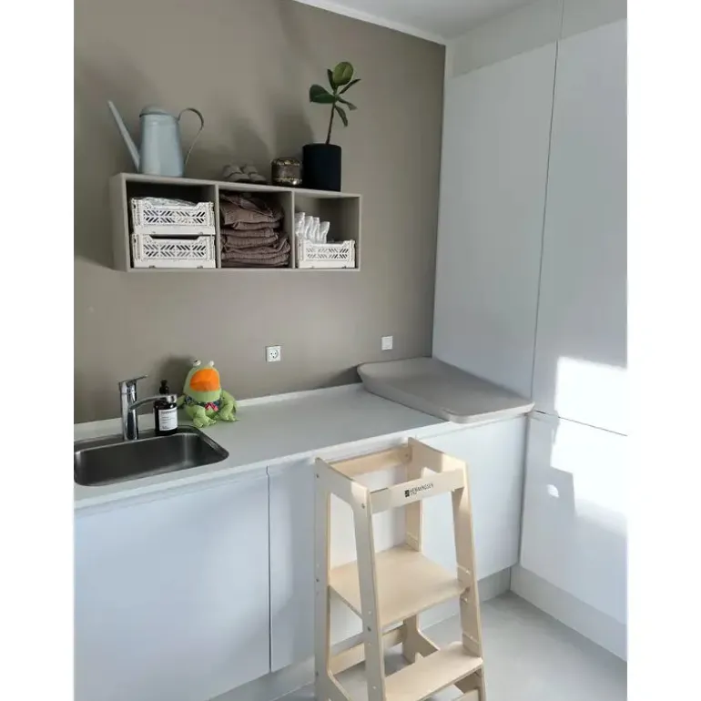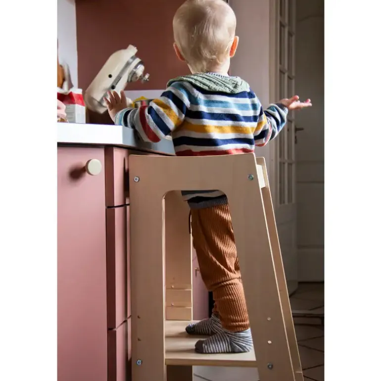 Ståpladen på læringstårnet kan også justeres i højden, så den passer til alle bord- og barnehøjder, og på den måde kan tårnet vokse med barnet.