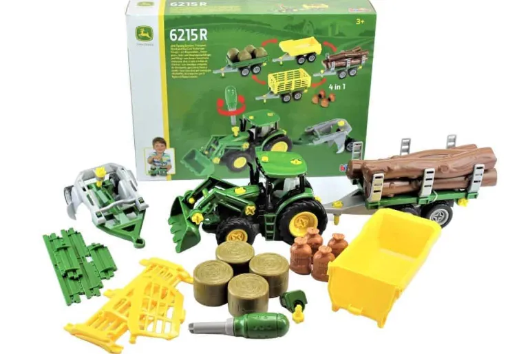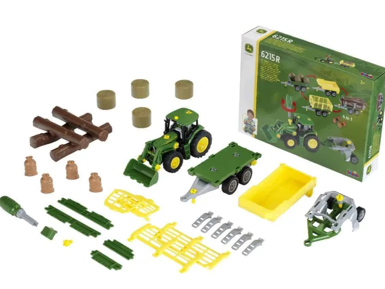 John Deere Traktor m/frontlæsser & anhænger 4 i 1. Kan skilles & samles igen. Mange dele som kan sættes på traktoren m/skruetrækker og dele som kan lægges i anhængeren. 59x39cm +3år