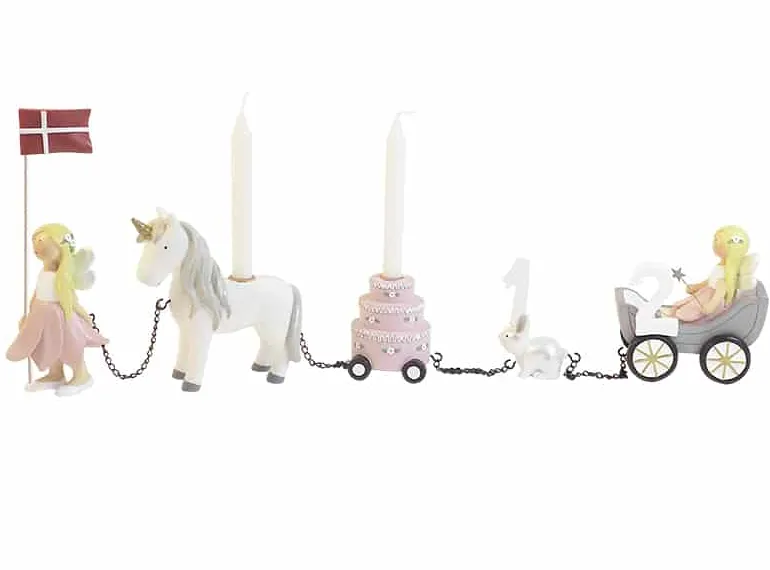 Fødselsdagstog, blomsterfeer m. 11 tal. Håndmalet. Polyresin materiale. Der er plads til to talnumre i toget. Inkl. flag og flagranke.