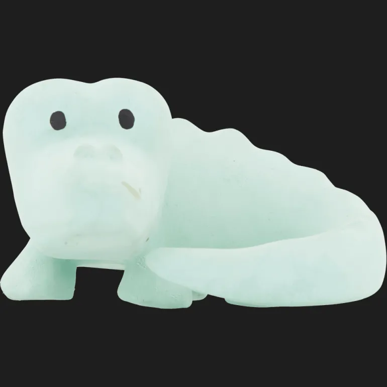 En sød lille gummi krokodille. Den er fantastisk til små ømme tænder og nemt for barnet at gribe og klemme om. Produktet har en lille klokke, der laver små ranglelyde som vil glæde og underholde de små. Produktet er Fremstillet af naturgummi, der høstes fra gummitræer, med en 12-årig livscyklus. BPA og phtalates fri.