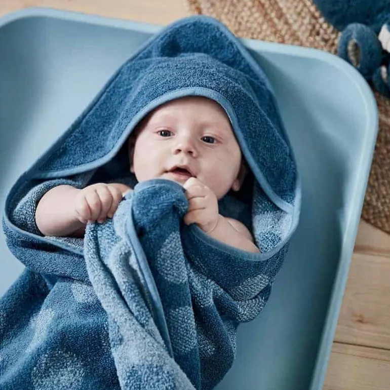 Hoodien er et lækkert og blødt frotté hættehåndklæde, som du kan svøbe dit barn i efter et dejligt bad. Hætten beskytter de små øre, så barnet ikke bliver afkølet. Fås i flere farver.