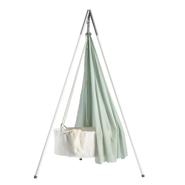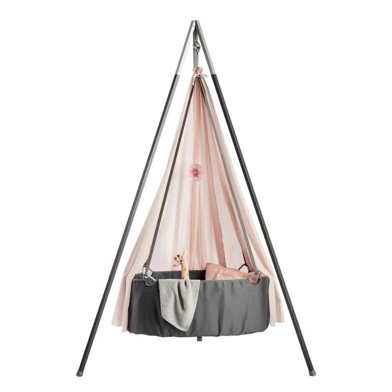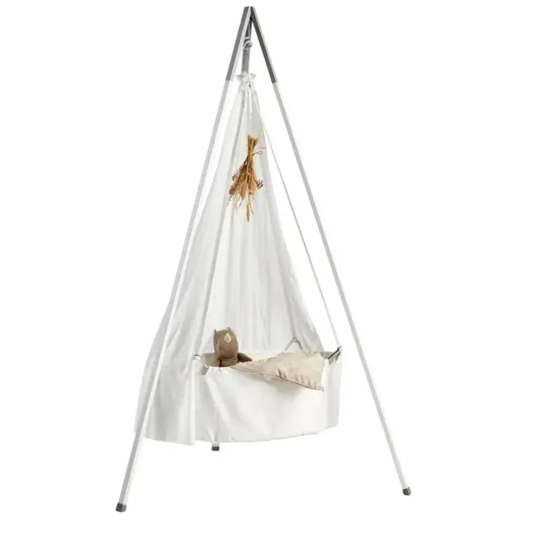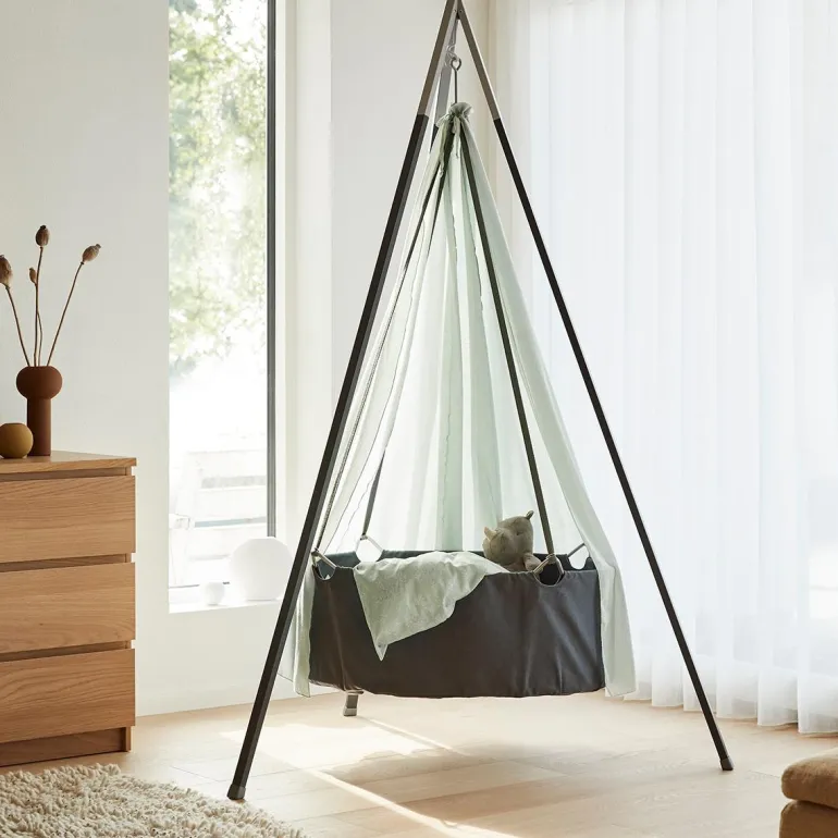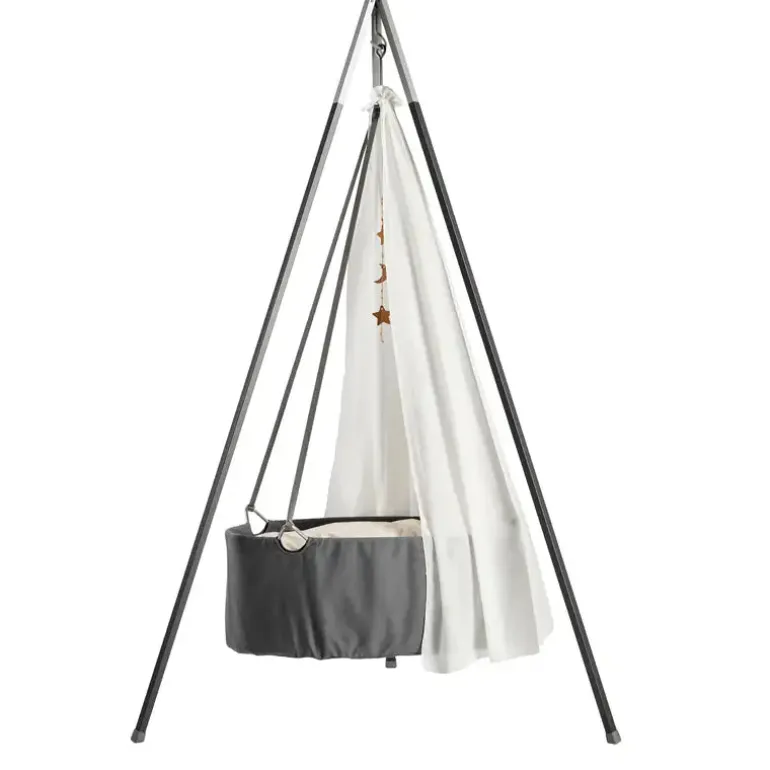 Leander Vuggestativ til Leander Vuggen er let at flytte rundt i rummet og kan klappes sammen når man ikke bruger det. Af sikkerhedsmæssige årsager bør stativet kun benyttes sammen med Leander vuggen. Ophængning af andre produkter eller genstande f.eks. fjedre i stativet sker på eget ansvar.