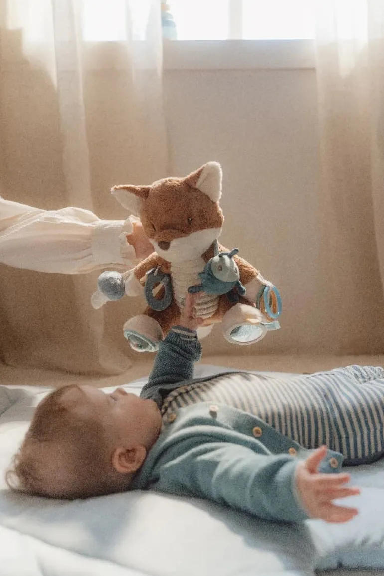 Kram og leg! Opdag alle de spændende aktiviteter, den aktivitets ræv gemmer på. Der er en knitrende bille på skulderen, en raslende lyd og etiketter som man kan røre ved og føle på. Ringene omkring benet, spejlet på den ene fod, den grønne hale – der er så mange detaljer, der kan vække den lilles nysgerrighed. Og efter al den leg inspirerer den yndige ræv til de sødeste drømme om en fortryllet skov, hvor Forest Friends leger.