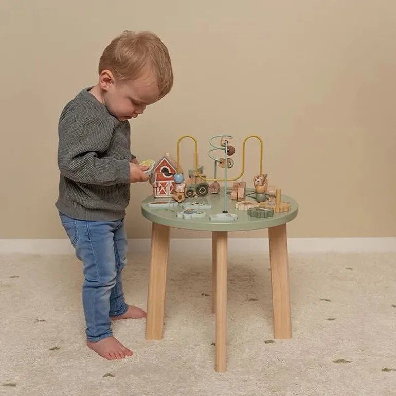 Stå op og leg! Opdag alle de aktiviteter dette bord har at byde på. Flyt perlerne fra den ene side til den anden på spiralstangen, byg bondegården, læg puslespillet eller drej på gearene og flyt de små får, køer og høns. Dette træaktivitetsbord udfordrer dit barn på mange måder. Der er 5 aktiviteter at udforske, hver især støtter udviklingen af finmotoriske færdigheder. Takket være det sikre og velafbalancerede design opmuntrer aktivitetsbordet også barnet til at stå op og bliver stående! Fordi alle de legemuligheder vil holde dit barn optaget i lang tid. Voksenmontering er påkrævet.