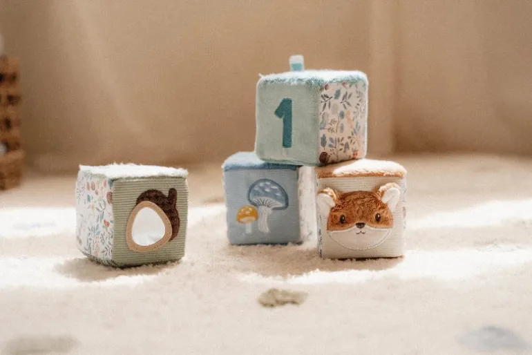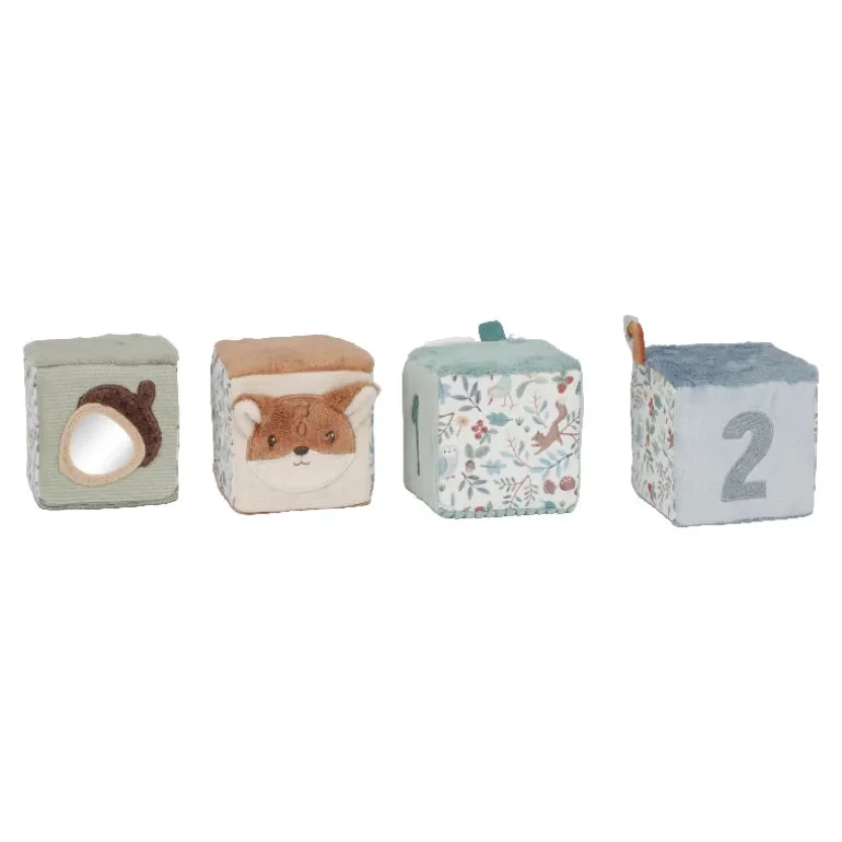 Med forskellige lyde, teksturer og farver at udforske vil dette sjove og søde sæt af bløde aktivitetsterninger fra Forest Friends kollektionen holde din lille underholdt i timevis, samtidigt med at det fremmer hånd-øje-koordination på en legende måde. Sættet består af 4 plysterninger i smukke farver og tallene fra 1 til 4. Terningerne er lette at gribe om for små hænder og der er masser af sjove mærkater, teksturer og et spejl at udforske.