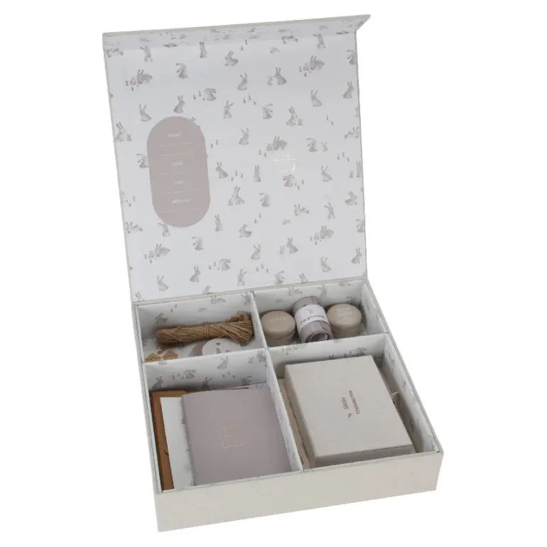 Mindeæsken indeholder fotohjørner, klistermærker, en æske til den første hårlok i tin, samt en tinæske til den første tand, målebånd, opbevaringspose til det første outfit og en opbevaringspose til sutten.