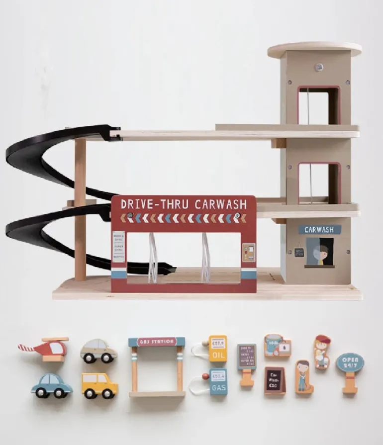 Stop ved parkeringsgaragen for at fylde benzin på, parkere din bil eller få den rengjort i bilvasken. Udvidelsessættet omfatter en garage med bilvask, biler, helikopter, tankstation, pumper, skilte og medarbejdere. Parkeringsgaragen er en af de mange legesæt, der kan kombineres med Little Dutch XXL togbanesættet. Parkeringsgaragen indeholder en helikopterplatform og træfigurerne og de forskellige dele har alle detaljerede illustrationer på begge sider. Lavet af holdbart og -certificeret træ. Ingen skinner er inkluderet i dette sæt.