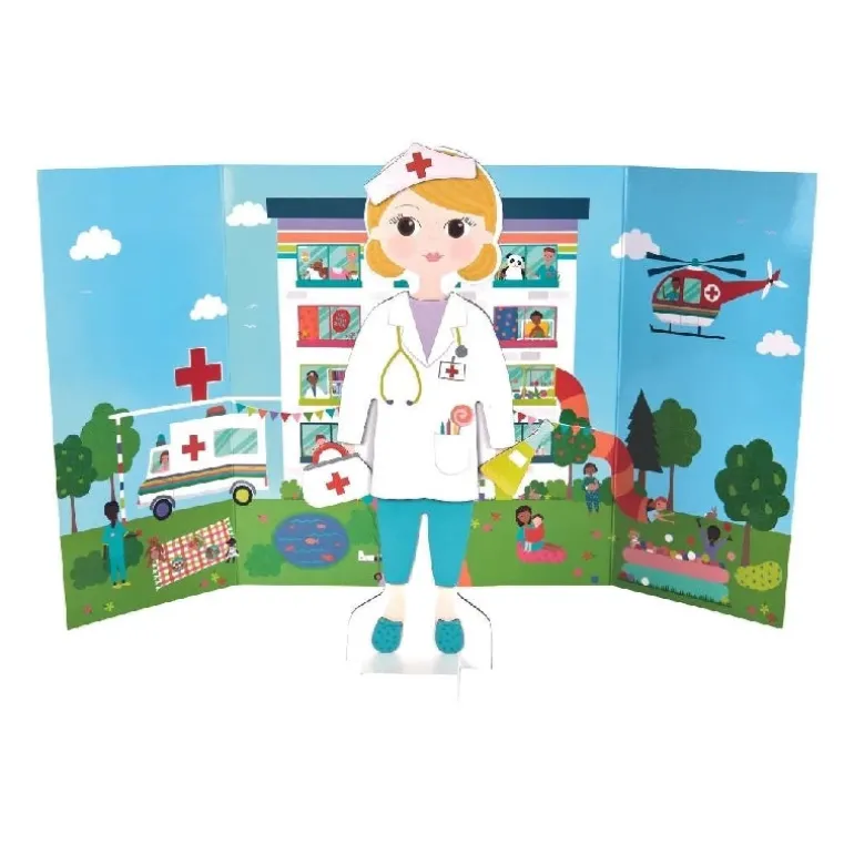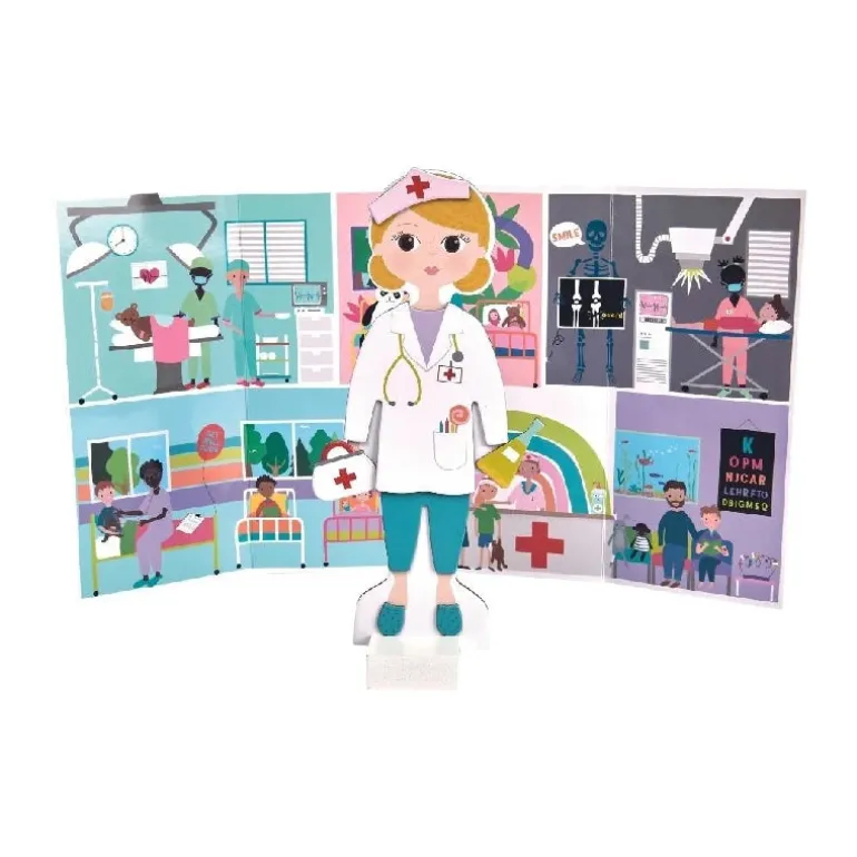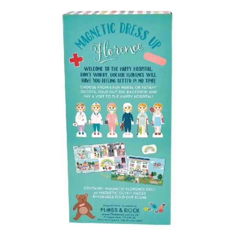 Florence elsker at lege hospital! Gør du? Klæd hende ud som læge, sygeplejerske, patient og meget mere. Med en dukke og et stativ, en vendbar baggrundsscene og 40 magnetiske stykker, alt sammen indeholdt i en smuk genanvendelig gaveæske. Dette er den perfekte gave til en spirende læge, sygeplejerske eller nogen, der bare elsker at lege hospital!