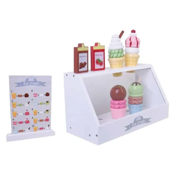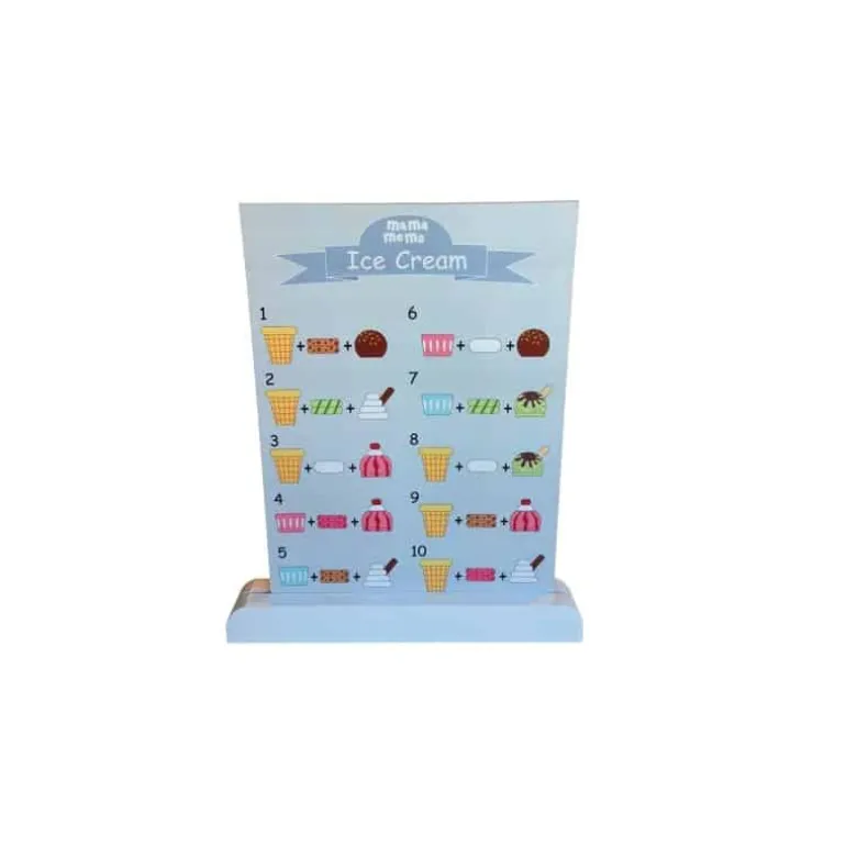 Mamamemo Isbar, virkelig fin isbod i træ til timevis af sjov rolleleg med at købe, sælge og lave is. Der medfølger alt hvad børnene skal bruge, for at kunne lave forskellige farverige isvafler og isbægre og på tavlen kan man dels vælge is, eller på bagsiden hente inspiration til hvordan de enkelte is sammensættes. Et rigtig godt stykke legetøj der indbyder til rolleleg, som vil udvikle børns kreativitet, ordforråd og sociale færdigheder.