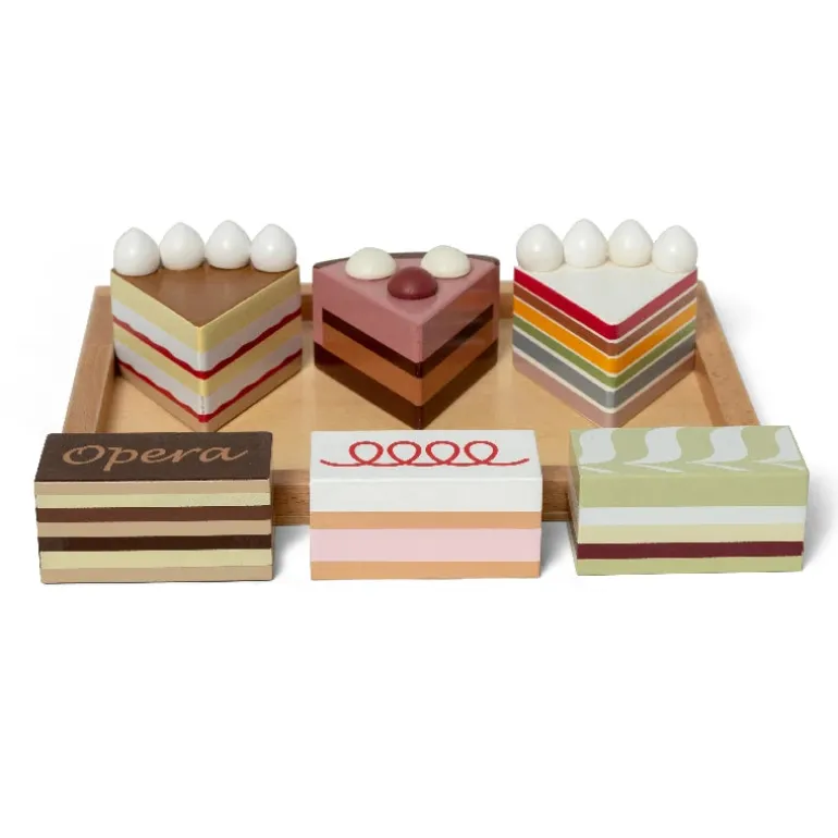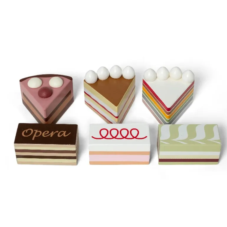 Med et ensemble af seks trælagkagestykker, der nærmest ser lige ud til at spise, er dette trælegetøj perfekt til den lille bager eller købmand.