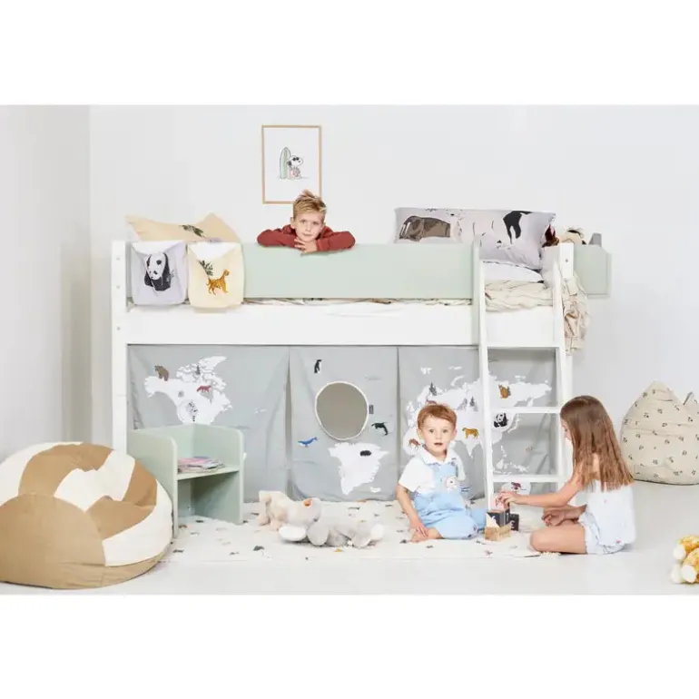 Denne seng kan købes med forskellige funktioner, fx rutsjebane som i vores Vilde sengekombination. Sengen er en del af et byggesystem. Det betyder, at du kan udvide og ombygge sengen efter dine behov, så dit barn kun har brug for én seng resten af barnets liv. Sengen kan fx bygges til en køjeseng, enkeltseng og meget mere.
