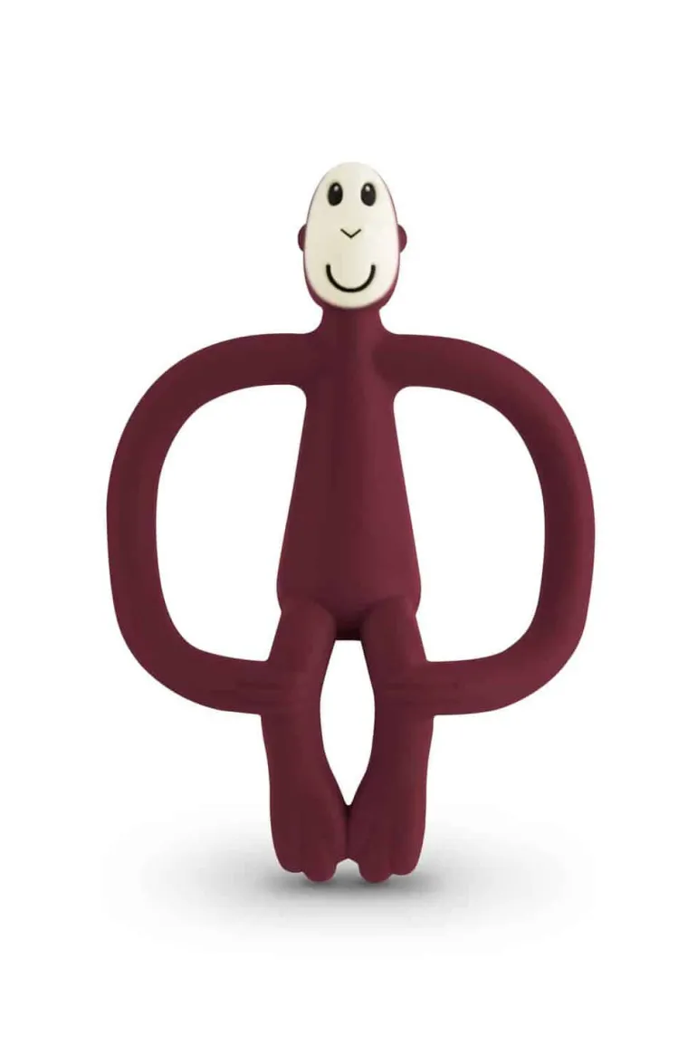 Matchstick Monkey Bidering – Claret. Sød lille bidering af blød silikone med ergonomisk design, så de små fingre nemt kan få fat i- og holde ved den. Bideringen er blød mod babys ømme gummer, når tænderne finder vej ud. Abens baghoved er designet med små bløde knopper, som kan afhjælpe kløe på gummerne. Den kan puttes i fryseren, så den er kold og dejlig at bide i.