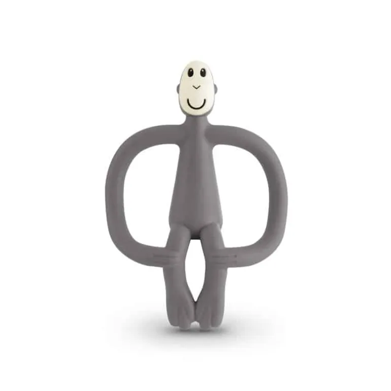Matchstick Monkey Bidering – Grå. Sød lille bidering af blød silikone med ergonomisk design, så de små fingre nemt kan få fat i- og holde ved den. Bideringen er blød mod babys ømme gummer, når tænderne finder vej ud. Abens baghoved er designet med små bløde knopper, som kan afhjælpe kløe på gummerne. Den kan puttes i fryseren, så den er kold og dejlig at bide i.