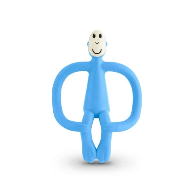 Matchstick Monkey Bidering – Lyseblå. Sød lille bidering af blød silikone med ergonomisk design, så de små fingre nemt kan få fat i- og holde ved den. Bideringen er blød mod babys ømme gummer, når tænderne finder vej ud. Abens baghoved er designet med små bløde knopper, som kan afhjælpe kløe på gummerne. Den kan puttes i fryseren, så den er kold og dejlig at bide i.