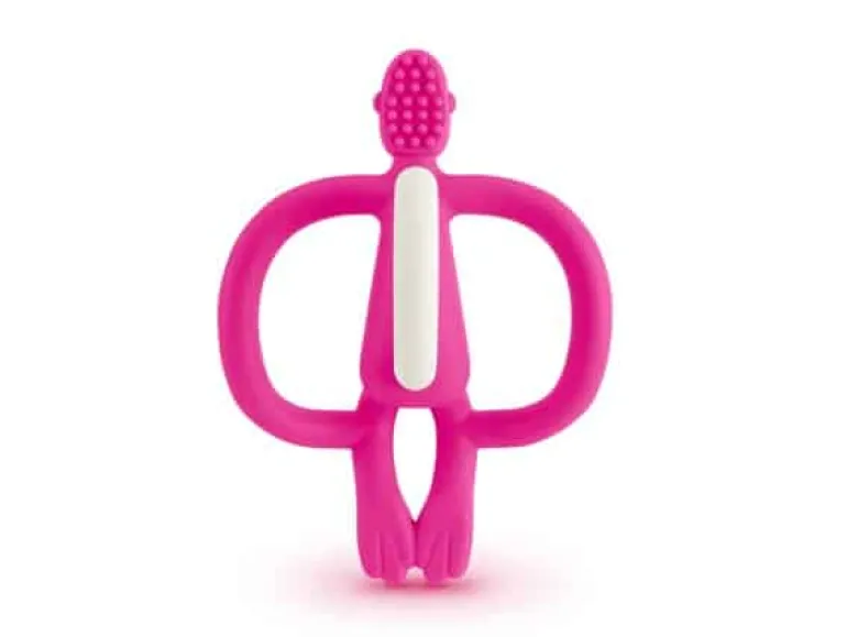 Matchstick Monkey Bidering – Pink. Sød lille bidering af blød silikone med ergonomisk design, så de små fingre nemt kan få fat i- og holde ved den. Bideringen er blød mod babys ømme gummer, når tænderne finder vej ud. Abens baghoved er designet med små bløde knopper, som kan afhjælpe kløe på gummerne. Den kan puttes i fryseren, så den er kold og dejlig at bide i.