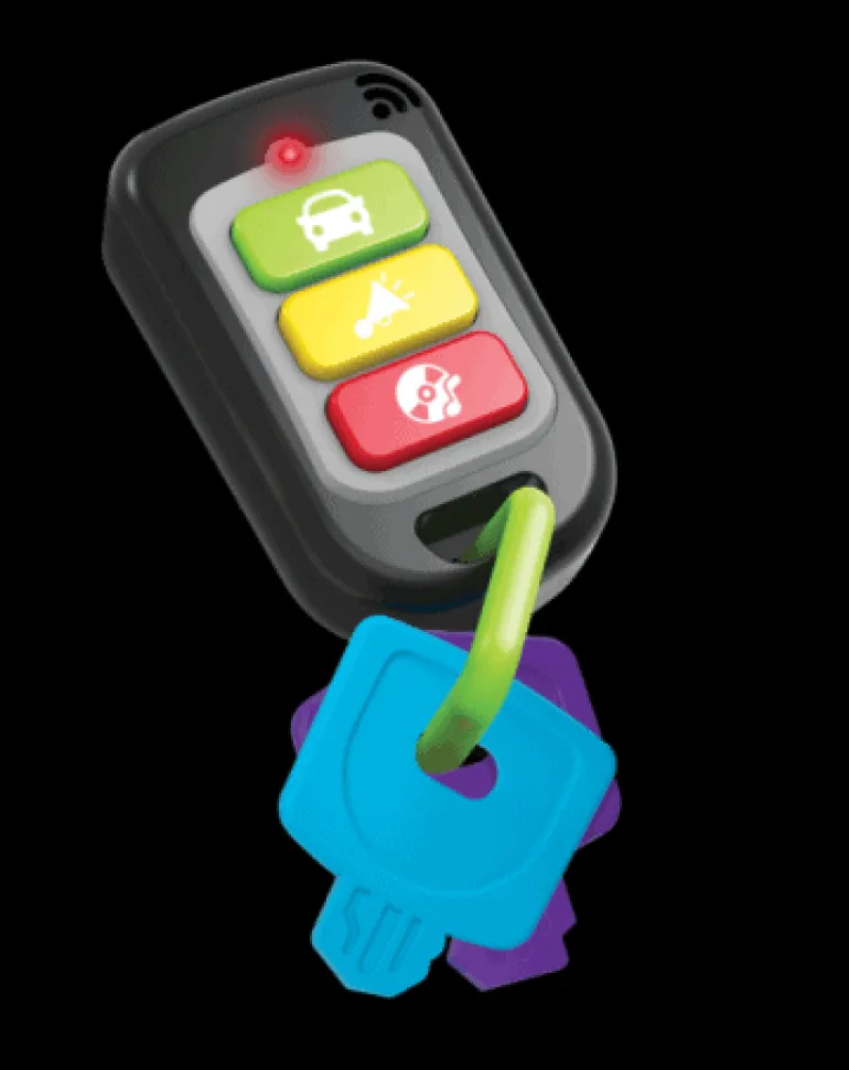 Mine første bilnøgler – ligesom mor og fars! Nøglering med 3 nøgler og en funktionel fjernbetjening til sjovt rollespil. Leg og lær med realistiske billyde og lyseffekter eller lyt til glad musik. Bruger 2 x AAA batterier (medfølger, men kun til demonstration). Fra +24 mdr.