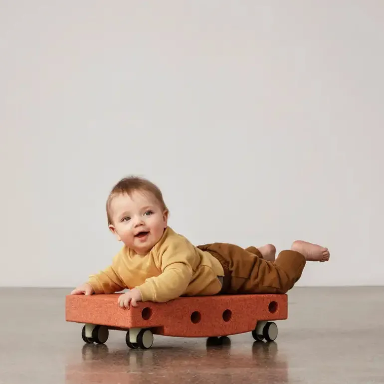 MODU Rullebrættet er et enkelt og alsidigt aktivitetslegetøj til grundlæggende motorisk træning med babyer og små børn. Læg dit barn på maven og sus rundt på gulvet, eller fjern hjulene og vip frem og tilbage. Selv små bevægelser og sanseindtryk kan bringe smilet frem hos små børn og det bliver kun sjovere! Som dit barn vokser, kan det suse og snurre sig selv rundt helt uden hjælp fra mor og far. Fjern hjulene og brug brættet til balancetræning, eller byg det om til en gyngehest eller lille gåbil ved at tilføje andre MODU-klodser.
