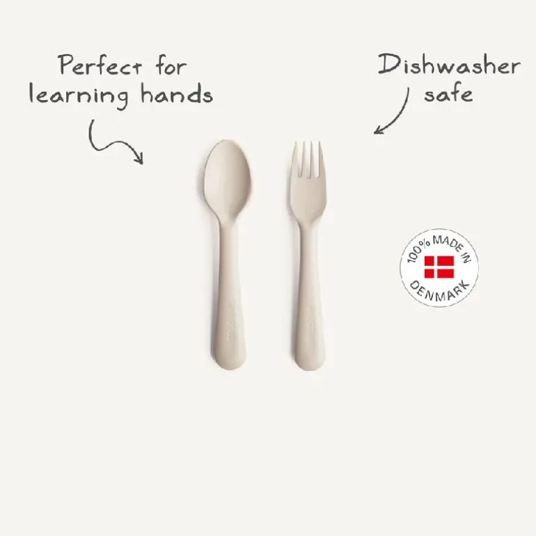 Gør overgangen til fast føde nem og behagelig med Mushies elegante bestiksæt, der er designet specielt til små hænder. Ske og gaffel har den ideelle størrelse og vægt, så de ligger godt i barnets hånd og gør det lettere at lære at spise selv.
