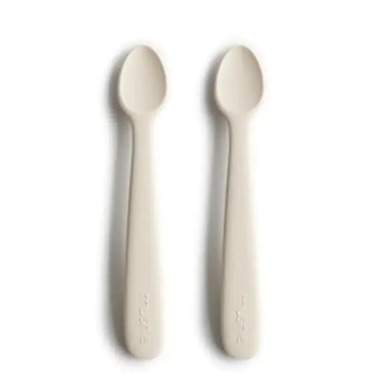 Giv din baby en tryg og komfortabel start på fast føde med Mushies babyskeer. Skeerne er designet med et langt skaft og et lille hoved, der gør det nemt og præcist at føre maden ind i den lille babymund.