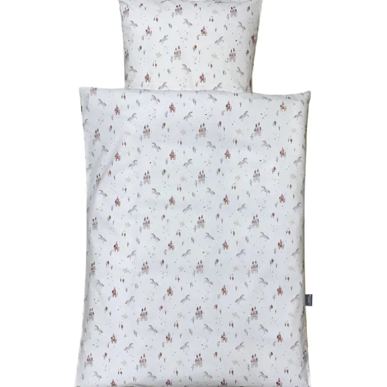 Eventyrligt junior sengesæt fra Nørgaard Madsen. Junior sengesættet er i en duset rosa farve med fine enhjørninger og slotte, produceret i en blød Oeko Tex certificeret bomuld og syet i Danmark.