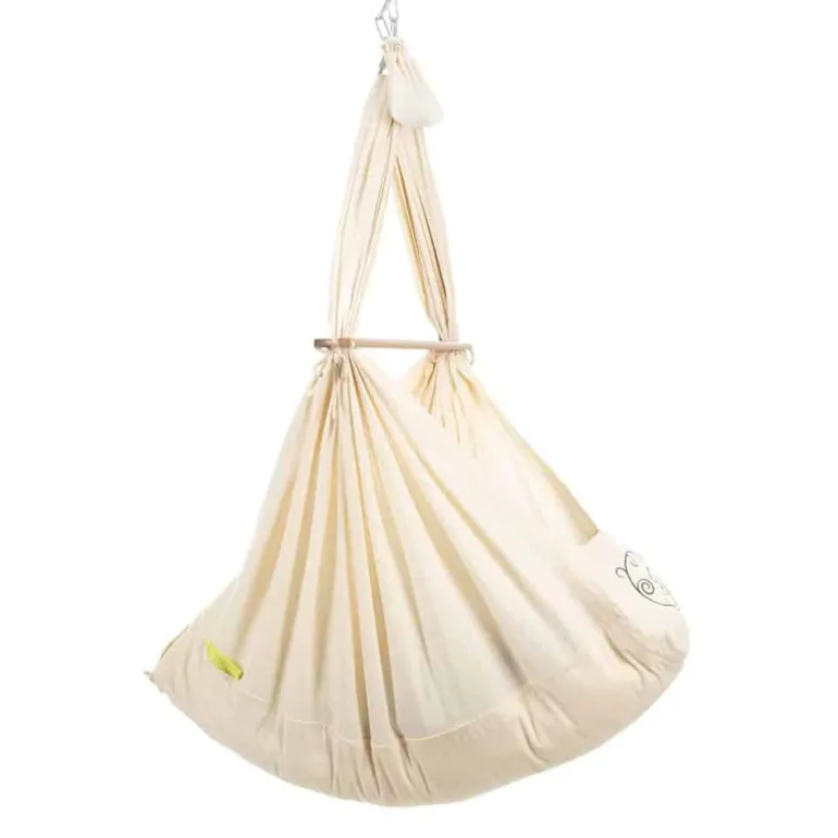NONOMO® Slyngevugge i GOTS certificeret bomuld er specielt god hvis dit barn har svært ved at falde i søvn. Nonomos fjeder vil hjælpe på en naturlig måde ved at rokke dit barn op og ned, ligesom i mors mave. Vuggen er formet ergonomisk, på denne måde fordeles barnets vægt jævnt og giver barnets ryg en sund og buet form. Dette aflaster noget af presset på halebenet og forhindre barnets hoved i at blive fladt.