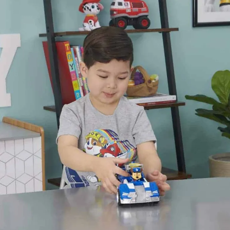 Slå dig sammen med Chase om større, dristigere redninger med hans PAW Patrol: The Movie transformerende Deluxe køretøj! Chase´s slanke politibil har sølvfarvet metallisk maling, autentiske filmdetaljer og grafik og en spændende forvandling direkte fra filmen! Chase er klar til at redde dagen i Adventure City, så han passer ind i sin helt nye filmuniform. Når problemerne rammer, skal du placere Chase bag rattet i sin cruiser og suse til undsætning! Skub spoileren ned for at aktivere køretøjets unikke transformation. Fronten udvides til pansret op-tilstand og en disk løfteraket dukker op i ryggen! Indlæs projektilerne (to medfølger), og tryk på knappen for at starte! Nulstil, transformér og start igen og igen! Chase’s Deluxe køretøj er en fantastisk gave til børn i alderen 3 og op og er den perfekte tilføjelse til enhver PAW Patrol køretøjer og legetøjsfigurer samling. PAW Patrol: The Movie Deluxe Vehicles bringer action og spænding fra det store lærred til live! Saml dem alle (legetøjskøretøjer sælges hver for sig), og brug din fantasi til at udspille dine actionfyldte redningsmissioner. For endnu mere film action, skal du bruge din Deluxe køretøj med den helt nye PAW Patrol tårn, Ultimate City Tower (sælges separat)! Red dagen med Chase og hans PAW Patrol: The Movie Deluxe køretøj!